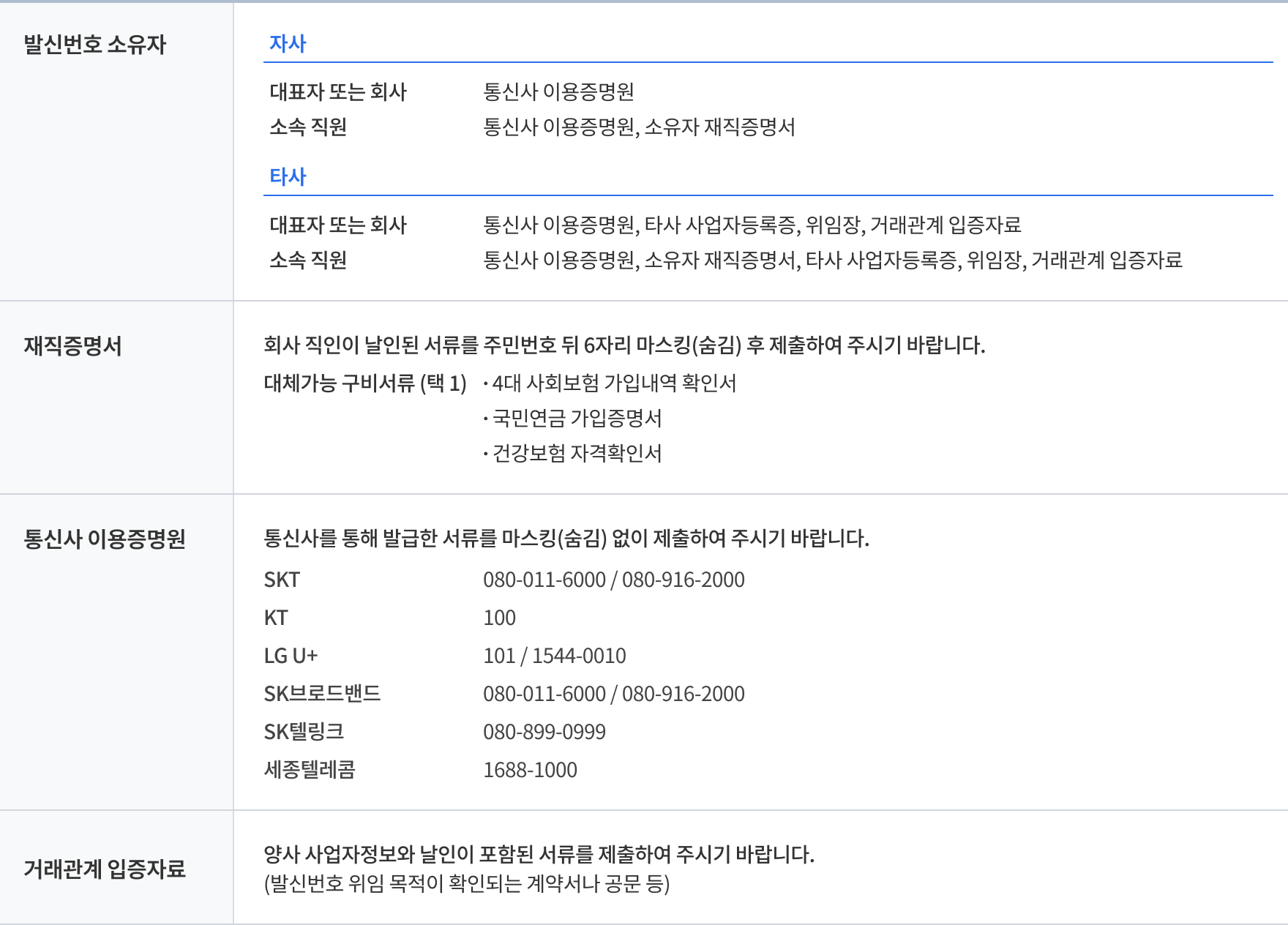 발신번호 등록은 제출서류를 준비하여 팝빌로 파일을 첨부하여 신청하는 방식으로만 이용이 가능합니다.