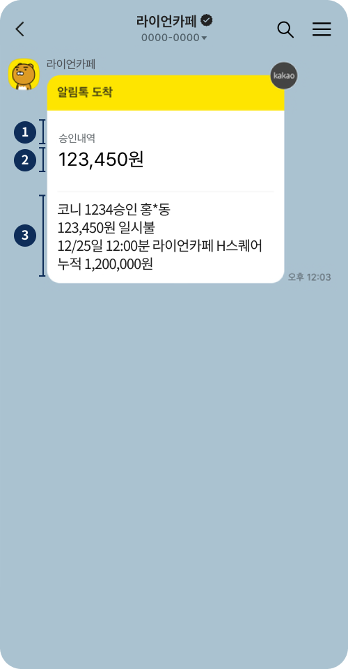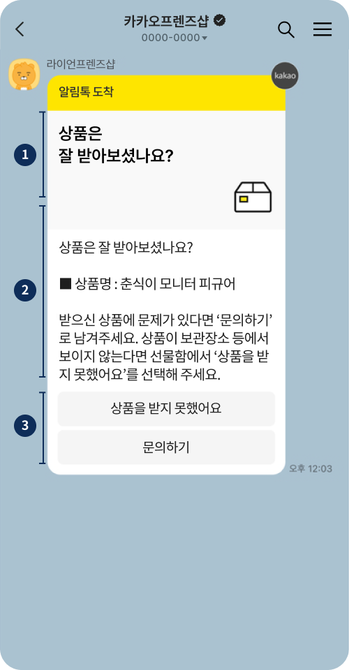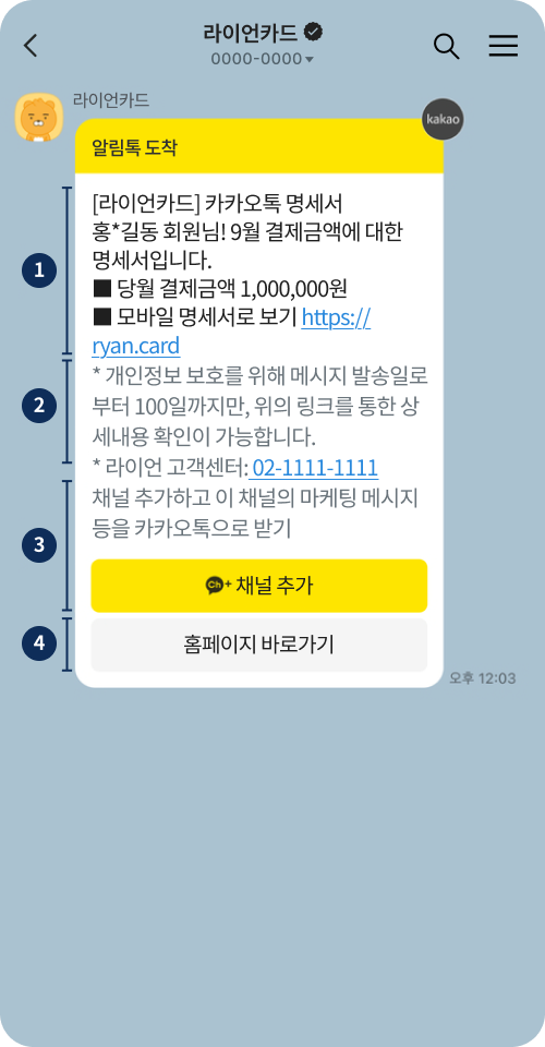 카카오톡 사용자의 채널추가 또는 별도 수신동의 없이 휴대폰번호를 기반으로 정보성 알림 메시지를 전송합니다.