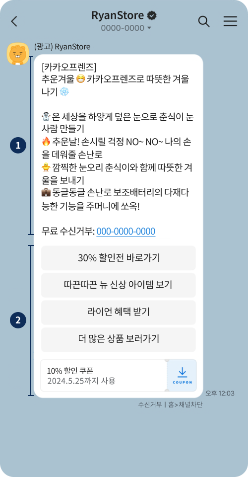 카카오톡 채널을 추가한 사용자를 포함하여 마케팅 정보 수신에 동의한 사용자에게도 광고성 메시지를 전송합니다.