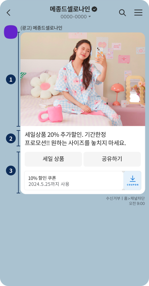 | 전송내용 | 광고성 메시지 - 광고, 이벤트, 프로모션, 안내 등 마케팅 메시지 ※ 정보통신망법에 따라 야간 시간대(20:50~익일 08:00 ) 전송 제한 |
