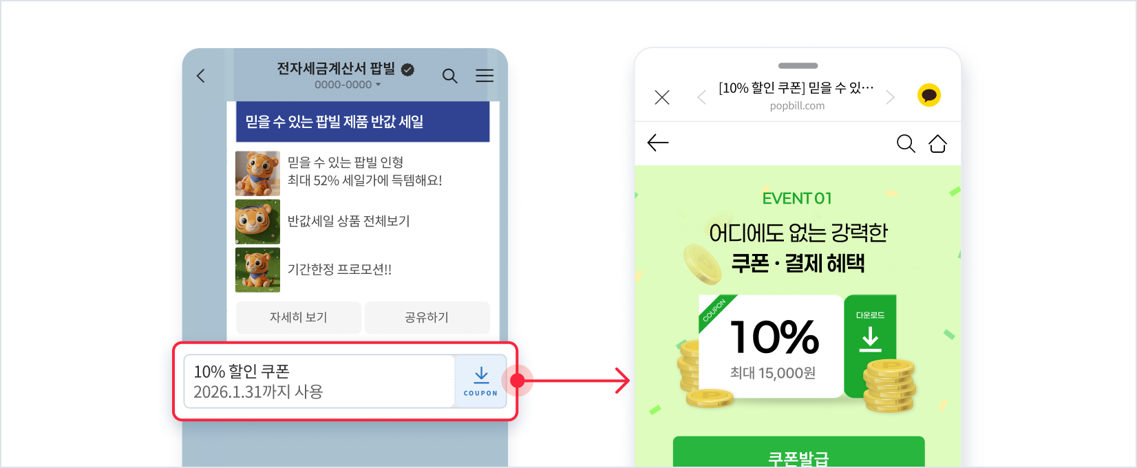 고객사가 직접 운영하는 웹사이트 또는 앱으로 연결하여 수신자가 쿠폰을 직접 발급받거나 코드 입력을 통해 쿠폰 혜택을 받을 수 있습니다.